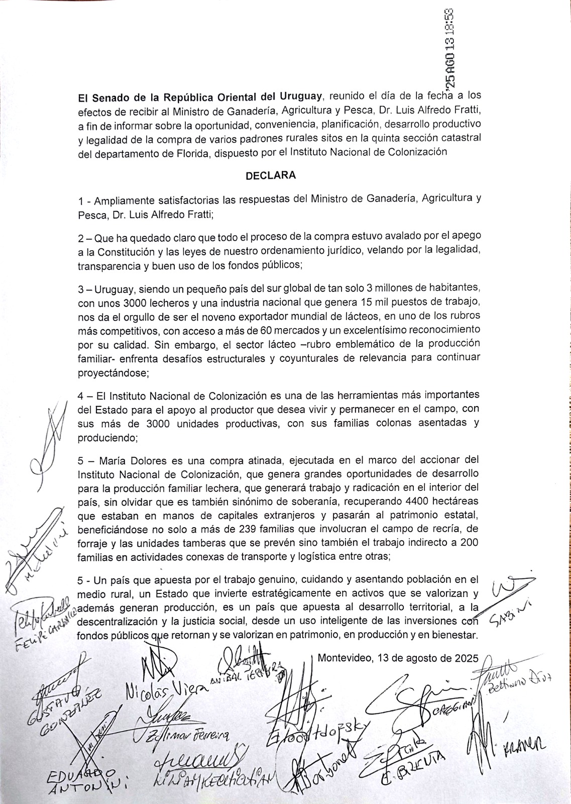 Que ha quedado claro que todo el proceso de la compra estuvo avalado por el apego a la Constitución y las leyes de nuestro ordenamiento jurídico, velando por la legalidad, transparencia y buen uso de los fondos públicos; Uruguay, siendo un pequeño país del sur global de tan solo 3 millones de habitantes, con unos 3000 lecheros y una industria nacional que genera 15 mil puestos de trabajo, nos da el orgullo de ser el noveno exportador mundial de lácteos, en uno de los rubros más competitivos, con acceso a más de 60 mercados y un excelentísimo reconocimiento por su calidad. Sin embargo, el sector lácteo -rubro emblemático de la producción familiar- enfrenta desafíos estructurales y coyunturales de relevancia para continuar proyectándose;