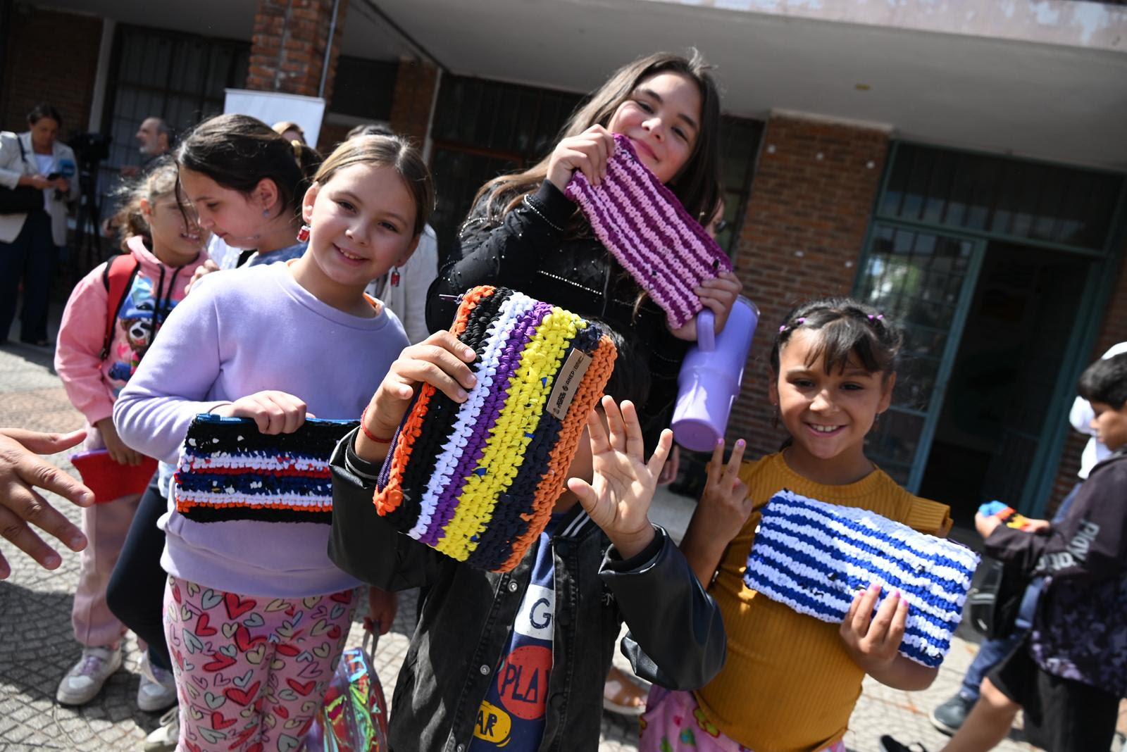 Niños y niñas de la Escuela N° 317, ubicada en el barrio Malvín Norte, recibieron este jueves una donación de 100 cartucheras confeccionadas con materiales textiles reutilizados, provenientes de productos incautados por la Justicia por estar en infracción marcaria.